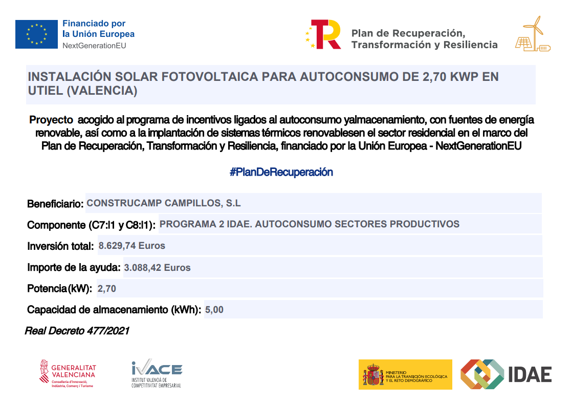 Recientemente, hemos recibido una subvención en el marco del Plan de Recuperación, Transformación y Resiliencia de la Unión Europea, a través del Instituto Valenciano de Competitividad Empresarial (IVACE). El importe de la subvención asciende a 3.088,42 Euros, respaldando nuestro proyecto de instalación fotovoltaica de 2,70 kW y capacidad de almacenamiento de 5,00 Kwh, fortaleciendo nuestro compromiso con la sostenibilidad.